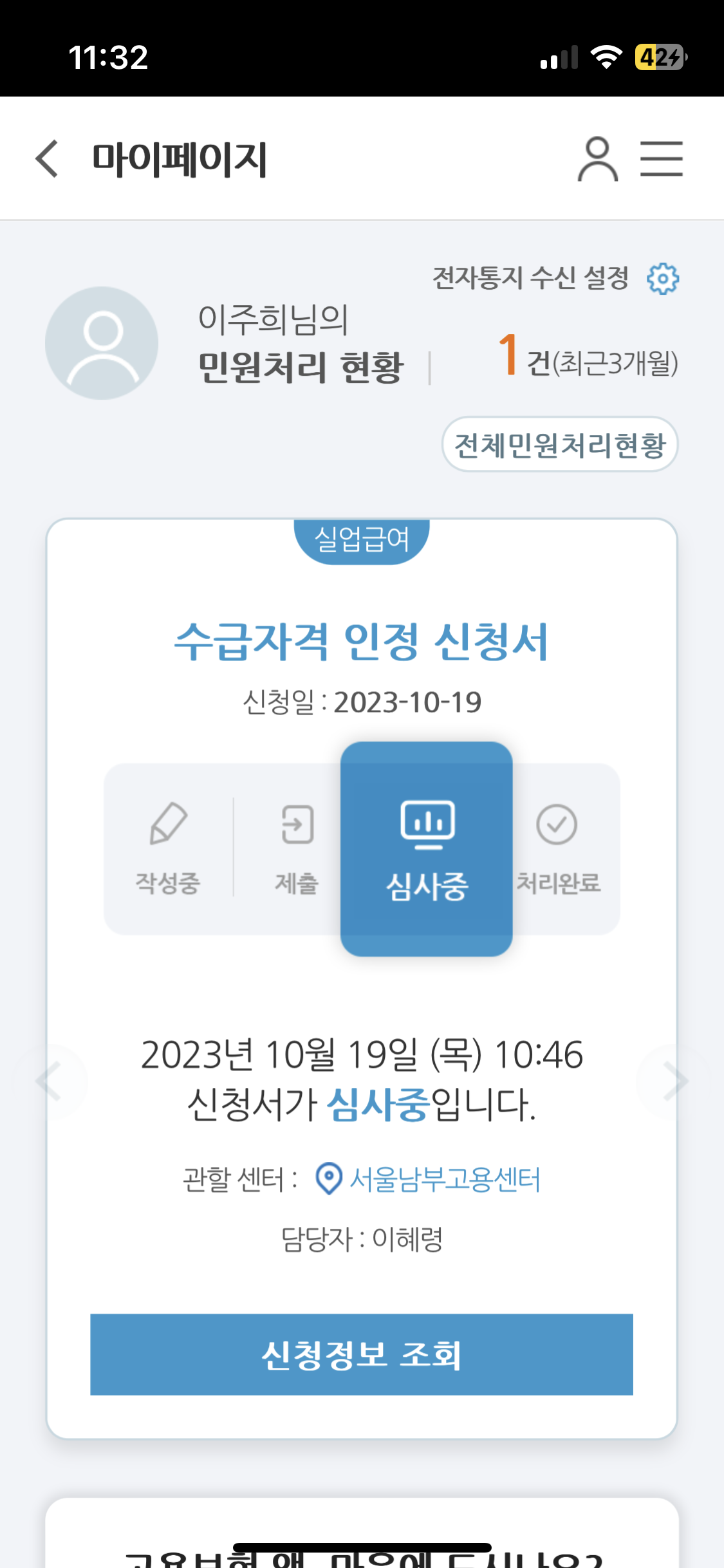 심사중으로 바뀌었고, 하루 더 지나니 처리완료로 변경되었다.