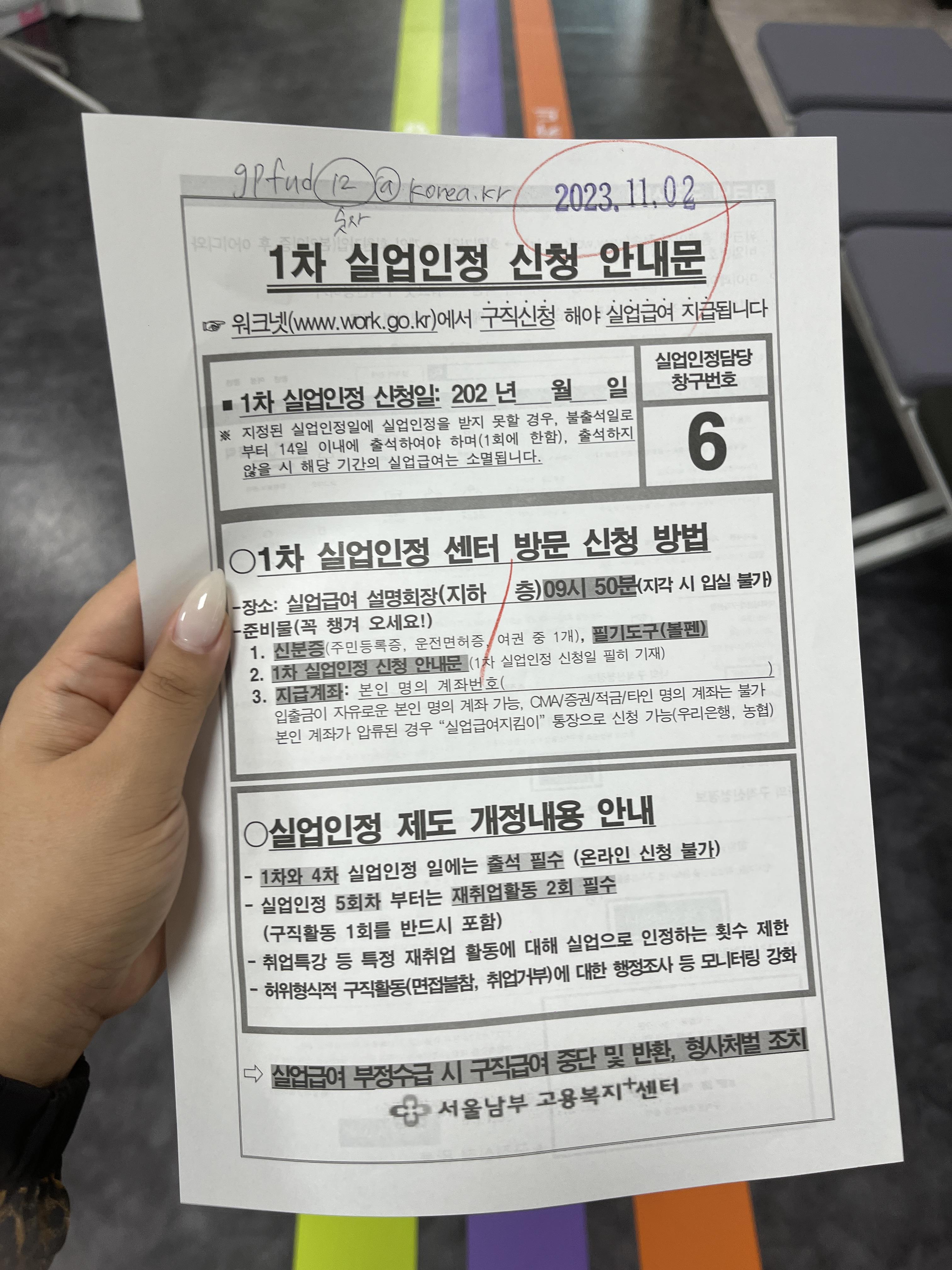 다시 고용센터를 방문해야 할 날짜가 적혀 있다.