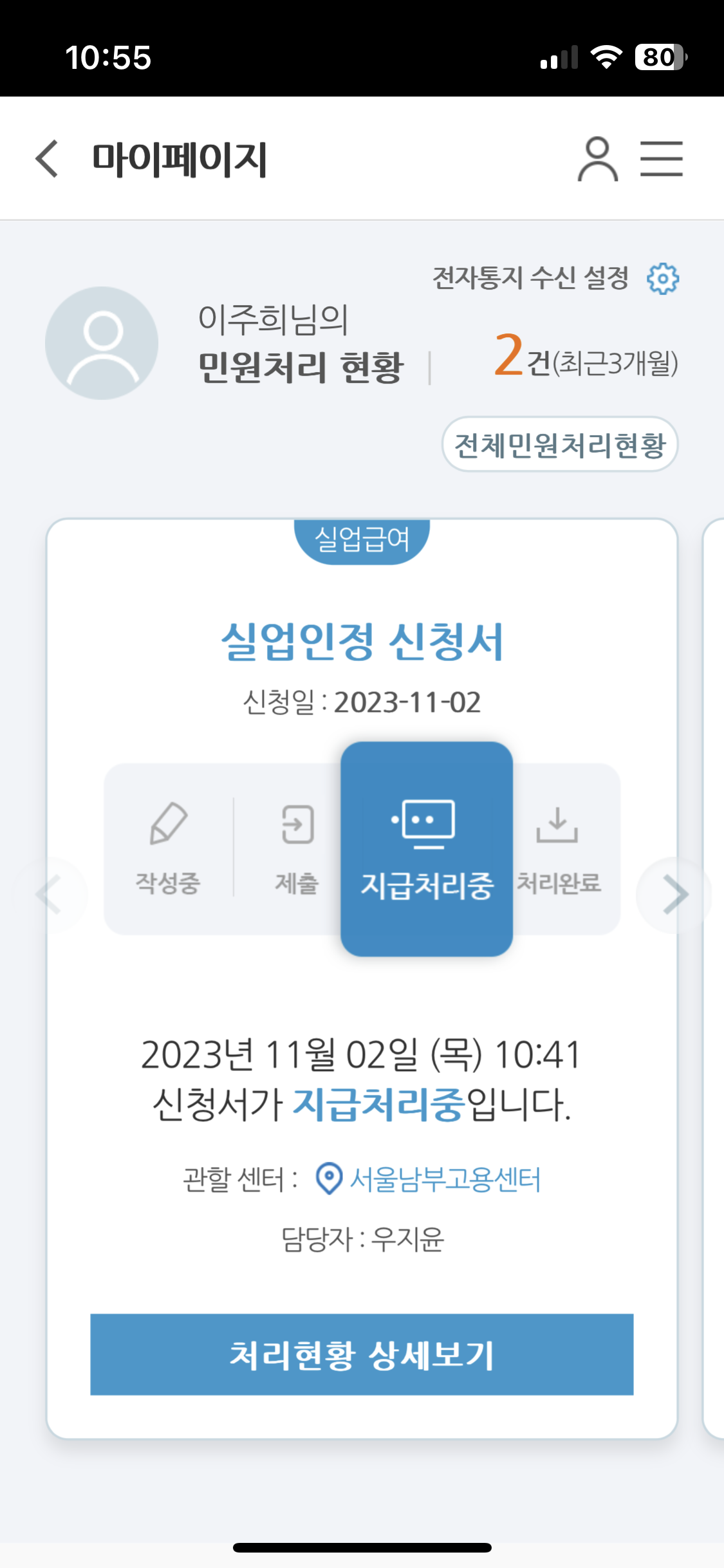 실업인정 신청이 정상적으로 전송되었습니다. -담당센터