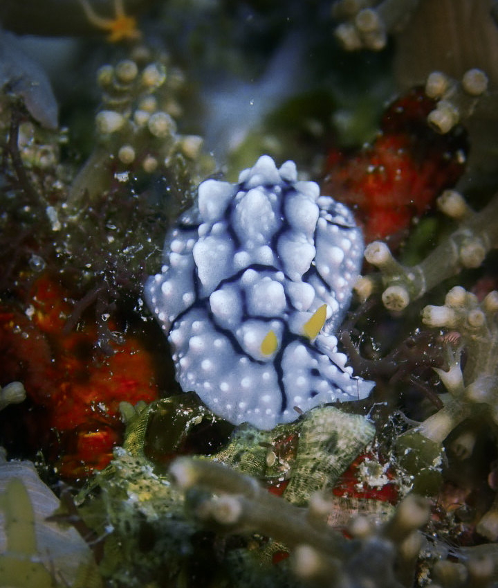 - 특징: 푸른색 몸에 노란색 점과 흰색 가장자리가 있는 화려한 갯민숭달팽이.