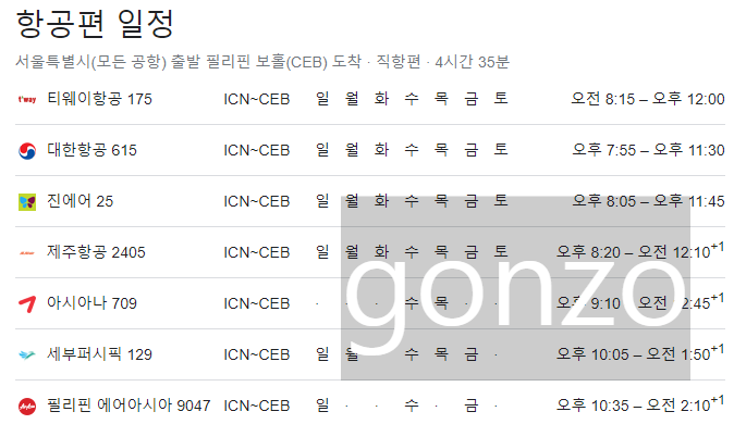 현재 인천-보홀 직항은 티웨이, 대한항공, 진에어, 제주항공, 아시아나, 세부퍼시픽, 필리핀에어아시아로 정말 다양한데요. 항공사마다 취항하는 요일과 시간이 다르니 참고하여 이용하시길 바랍니다.